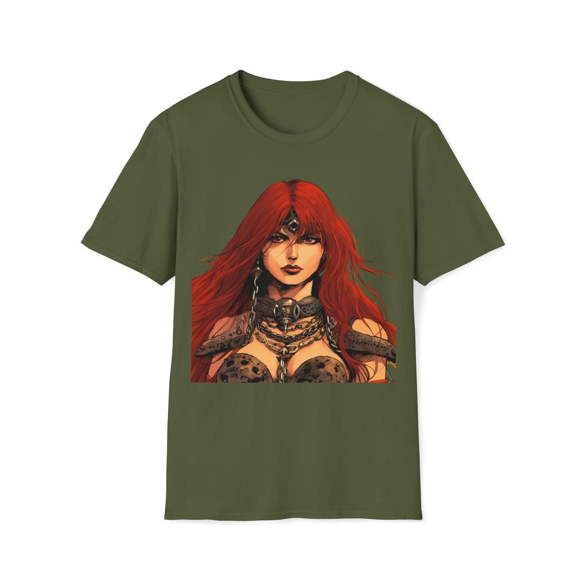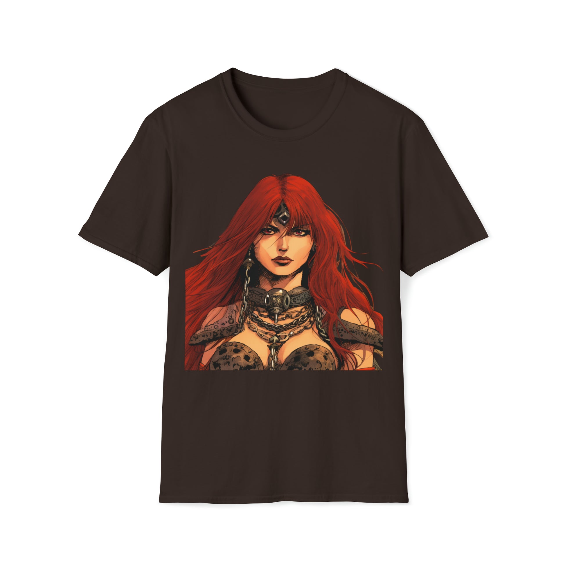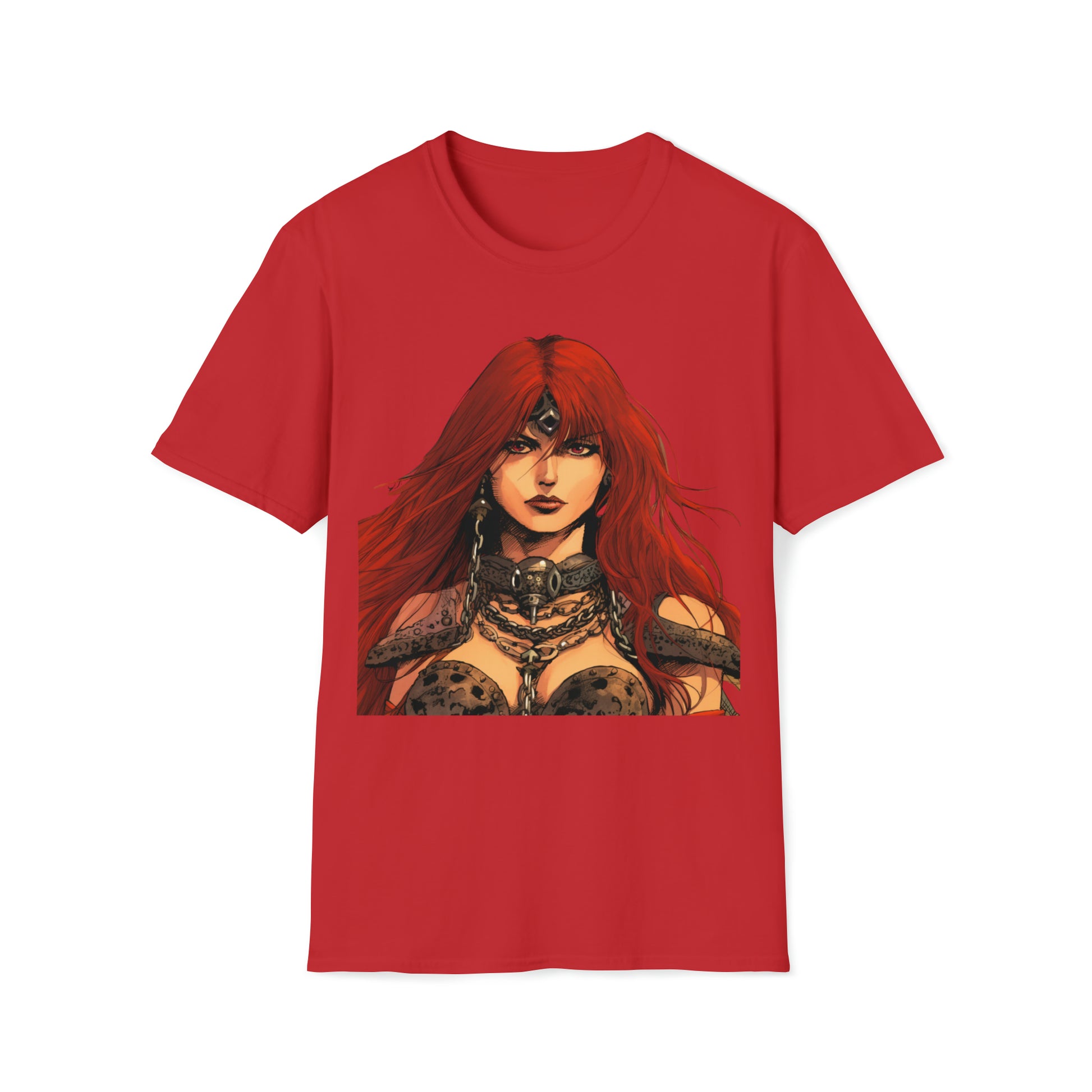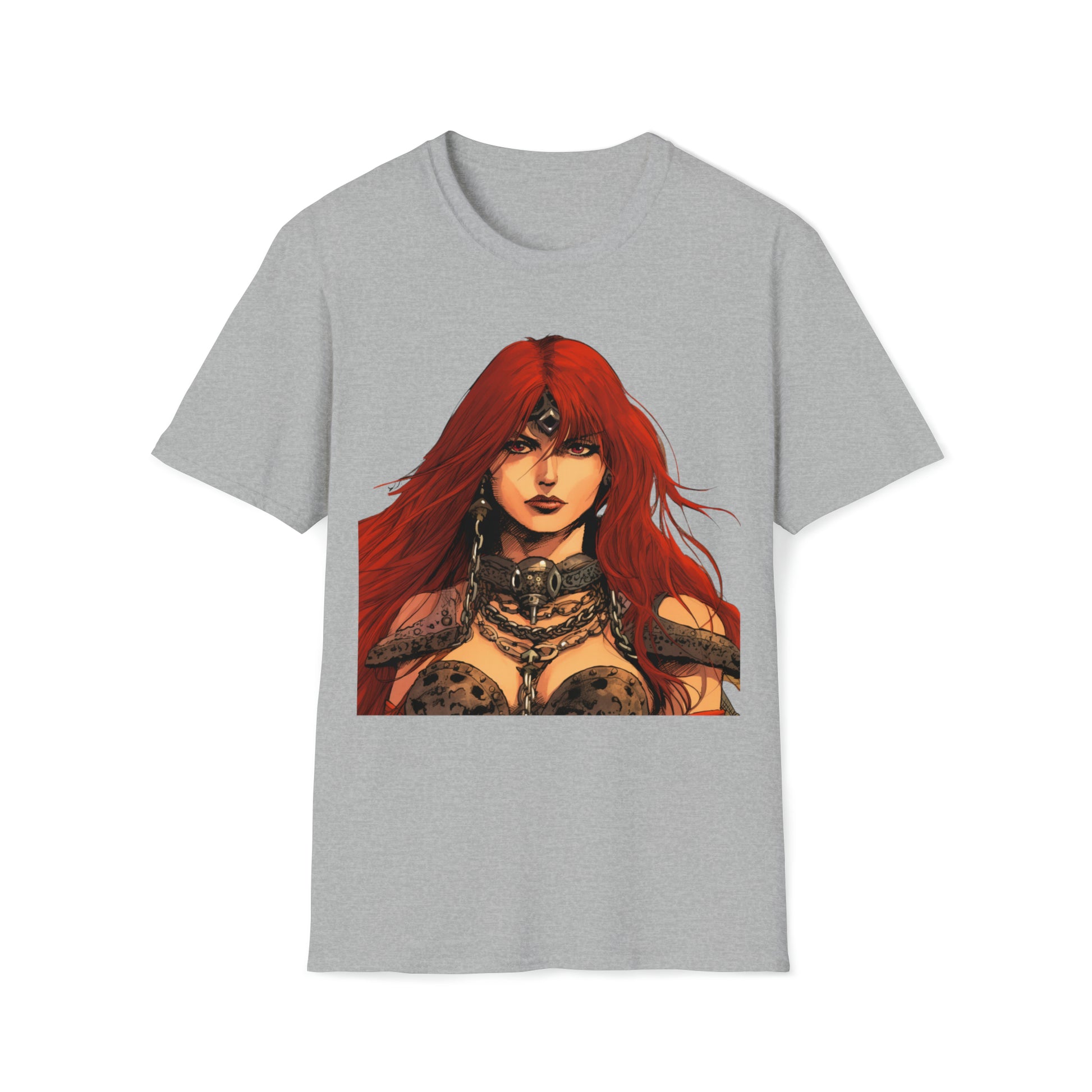 Embrace the allure of Red Sonja, a symbol of strength and valor, as she stands proudly as the greatest swordswoman of her time. With her fierce determination and unmatched skills, she becomes an embodiment of empowerment and inspiration.The unisex soft-style t-shirt puts a new spin on casual comfort. Made from very soft materials, this tee is 100% cotton for solid colors. Heather colors and sports grey include polyester. The shoulders have twill tape for improved durability. There are no side seams. The collar is made with ribbed knitting to prevent curling damage.